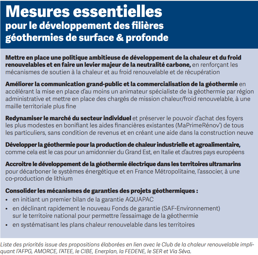 S'appuyant sur ces potentiels, l'AFPG propose donc 6 mesures essentielles pour le développement des filières géothermies de surface et profonde, pour :